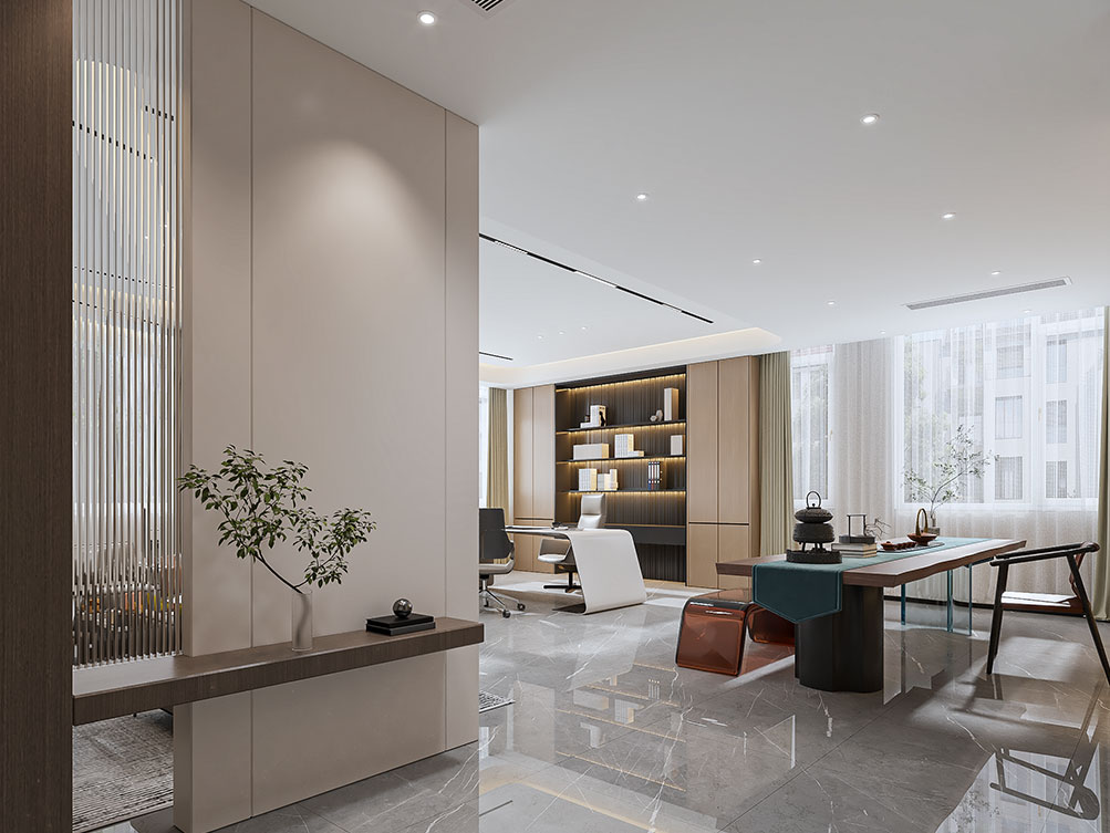 新中式辦公室裝修風(fēng)格是傳統(tǒng)與創(chuàng)新的巧妙融合,摒棄了傳統(tǒng)中式風(fēng)格的厚重繁復(fù),提煉并傳承其最具魅力的設(shè)計(jì)元素與核心理念,再搭配現(xiàn)代化設(shè)計(jì)元素與新型裝修材料進(jìn)行點(diǎn)綴修飾。它是在深入理解中國(guó)傳統(tǒng)文化的基礎(chǔ)上,融入現(xiàn)代設(shè)計(jì)思維,打造出兼具中式韻味與現(xiàn)代辦公舒適度的獨(dú)特空間。